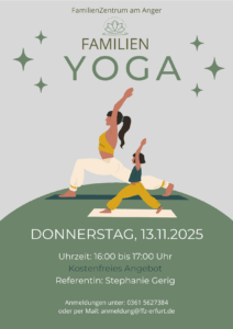 habt ihr Lust mal wieder so richtig zu entspannen? Am 13. November 2025 könnt ihr euch beim Familienyoga im FamilienZentrum Zeit für euch selbst und eure Familie nehmen und dabei richtig zur Ruhe kommen. Unter fachkundiger Anleitung wollen wir uns dehnen und bewegen, wobei der Spaß natürlich nicht fehlen darf.