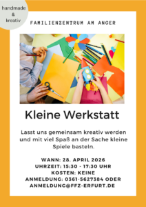 am 28. April 2026 wollen wir wieder zusammen scheiden, kleben und malen. In unserer kleinen Werkstatt dreht sich alles um das Thema Spiele basteln. Kommt gerne vorbei, werdet kreativ und das Wichtigste: Habt Spaß! 🙂