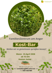 am Mittwoch den 22. April 2026 wollen wir wieder unsere Kost-Bar eröffnen. Gemeinsam werden wir kleine Sprossensamen pflanzen und ganz persönliche Beete erschaffen. Meldet euch gerne an. Wir freuen uns auf euch! 🙂