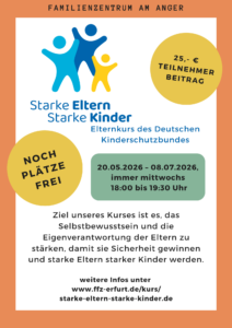 am 20. Mai 2026 startet der Elternkurs des Deutschen Kinderschutzbundes bei uns: Starke Eltern – Starke Kinder. Bei insgesamt 8 Terminen, haben Eltern die Möglichkeit den autoritativen Erziehungsstil kennenzulernen, ihr Selbstbewusstsein zu stärken und an Sicherheit im Umgang mit ihren Kindern zu gewinnen. Der Kurs hilft, Kinder besser zu verstehen, gelassener zu reagieren und Herausforderungen wie Stress oder Konflikte zu bewältigen.