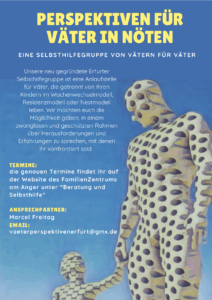 Wir sind eine junge, neu gegründete Erfurter Selbsthilfegruppe, die es sich zur Aufgabe gemacht hat, eine Anlaufstelle für Väter zu sein, die getrennt von ihren Kindern im Wochenwechselmodell, Residenzmodell oder Nestmodell leben.